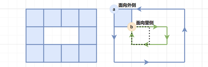3. 如果这个点的右下方有方块,则路径面向「外侧」,应采用逆时针序