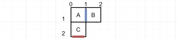 一个正方形有四条边,一条边最多被两个方块所共享。**未被共享的边在边界上,而被共享的边在内部。**如下图所示,蓝色边被A、B两个方块共享,而红色边不被共享。