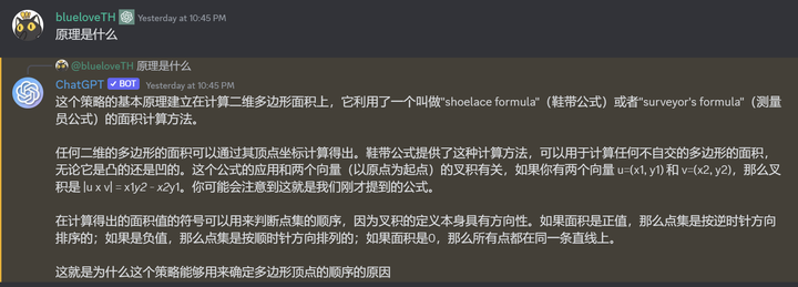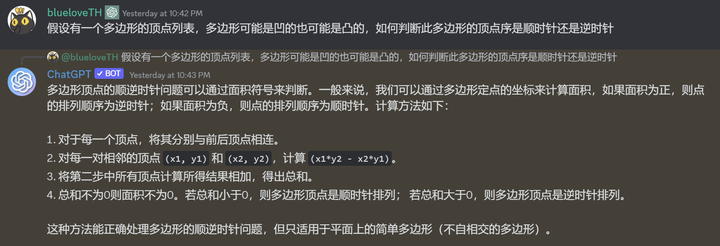 ChatGPT告诉我们,有一种叫做shoelace formula的算法,它可以从顶点坐标中计算一个不自相交的多边形的面积,无论这多边形是凹的还是凸的。与此同时,面积的符号即对应着我们要求的顶点序