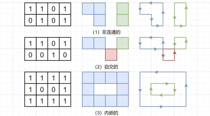实际的场景往往不像上述例子那样简单,我们需要考虑算法在任意Tilemap上的适用性。其中最典型的三种情况是:非连通、自交的和内嵌的