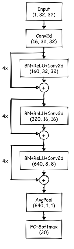 特征工程 特征部分采用1x32x32的对数梅尔频谱图(Log-Melspectrogram) ,关于它的介绍网上已有很多资料。这是一种很常规的特征,几乎所有音频任务都有用到。